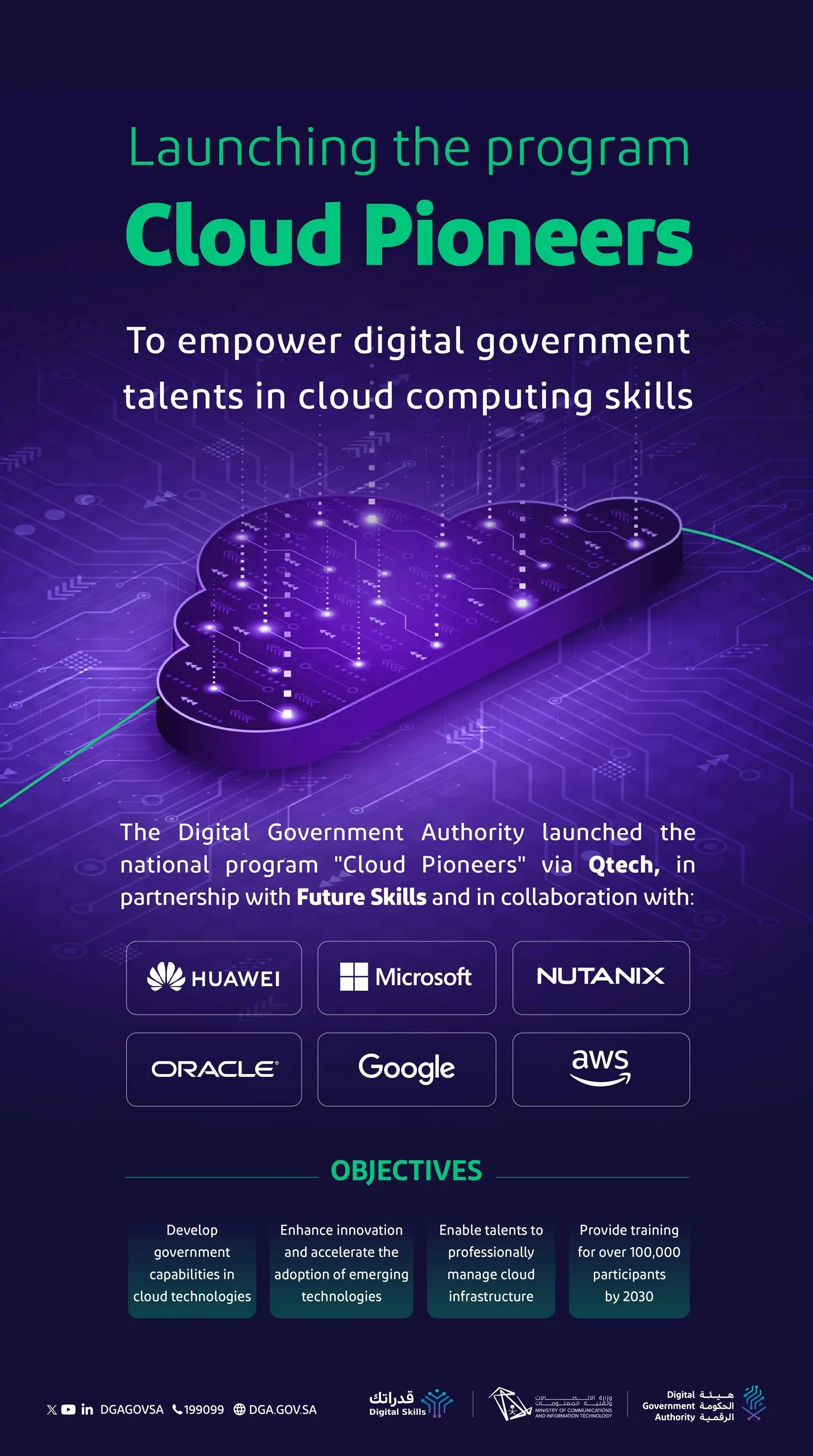 The Digital Government Authority (DGA) has announced the launch of the national “Cloud Pioneers” program through the Qtech initiative, aiming to develop and empower government professionals in cloud technologies and enhance the readiness of national talent to leverage the latest digital solutions supporting Saudi Arabia’s digital transformation journey.