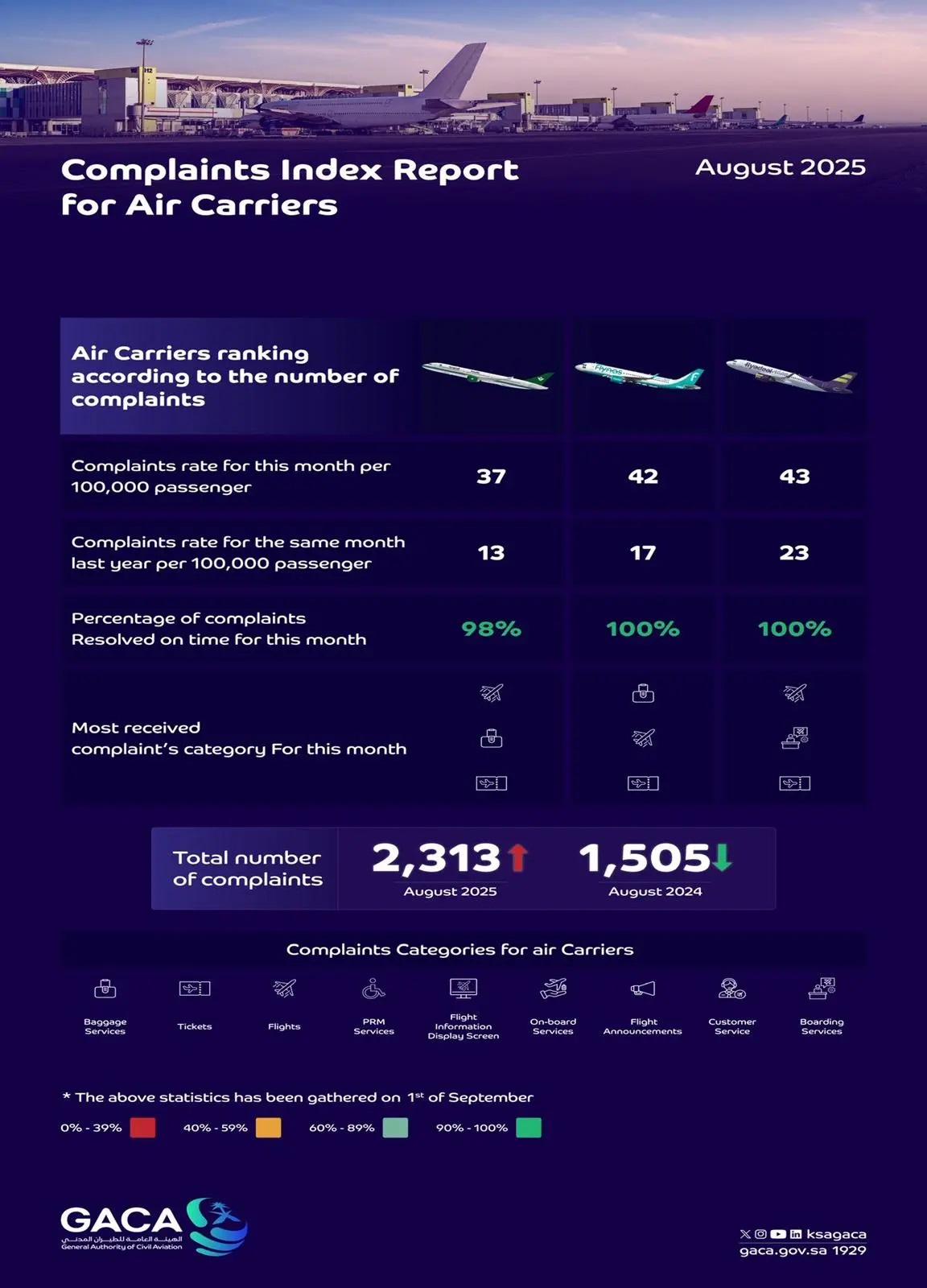 The General Authority of Civil Aviation (GACA) today issued its air transport service provider and airport classification index for August 2025, which is based on the 2,313 total passenger complaints submitted to the authority during the month.