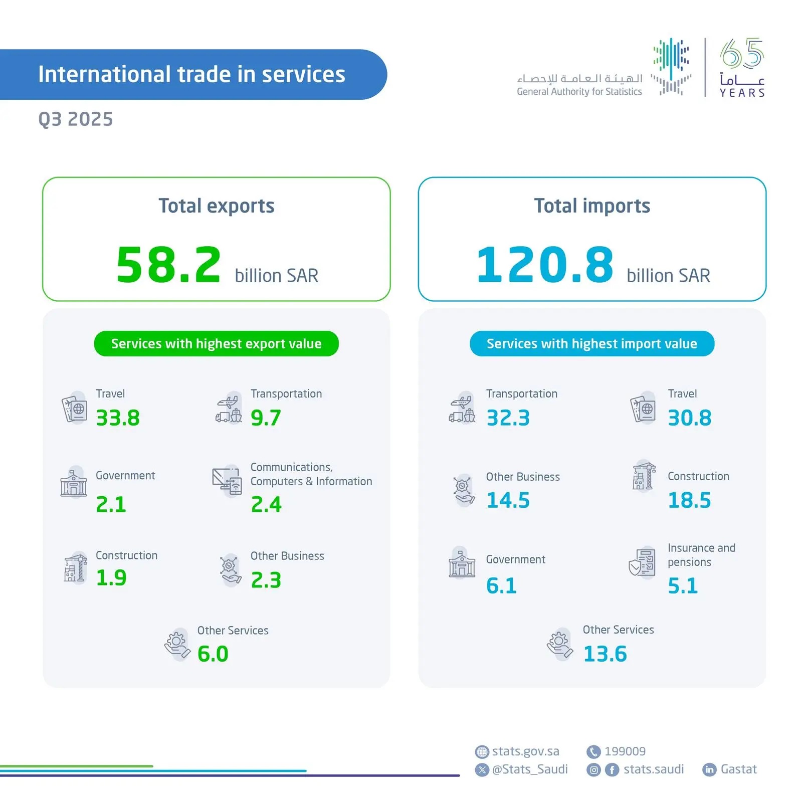 The General Authority for Statistics (GASTAT) reported that Saudi Arabia’s service exports totaled SAR58.2 billion in the third quarter of 2025, while service imports amounted to SAR120.8 billion.