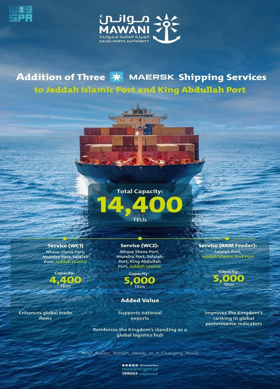 The Saudi Ports Authority (Mawani) announced the addition of three new shipping services operated by global shipping company Maersk to Jeddah Islamic Port and King Abdullah Port, reinforcing the Kingdom’s position as a key maritime trade hub and enhancing its regional and global competitiveness.