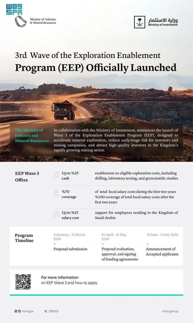 Applications for EEP Wave 3 open on January 14, 2026. The initiative leverages Saudi Arabia’s investment-attractive environment, political stability, streamlined licensing framework, and integrated mine-to-market infrastructure.