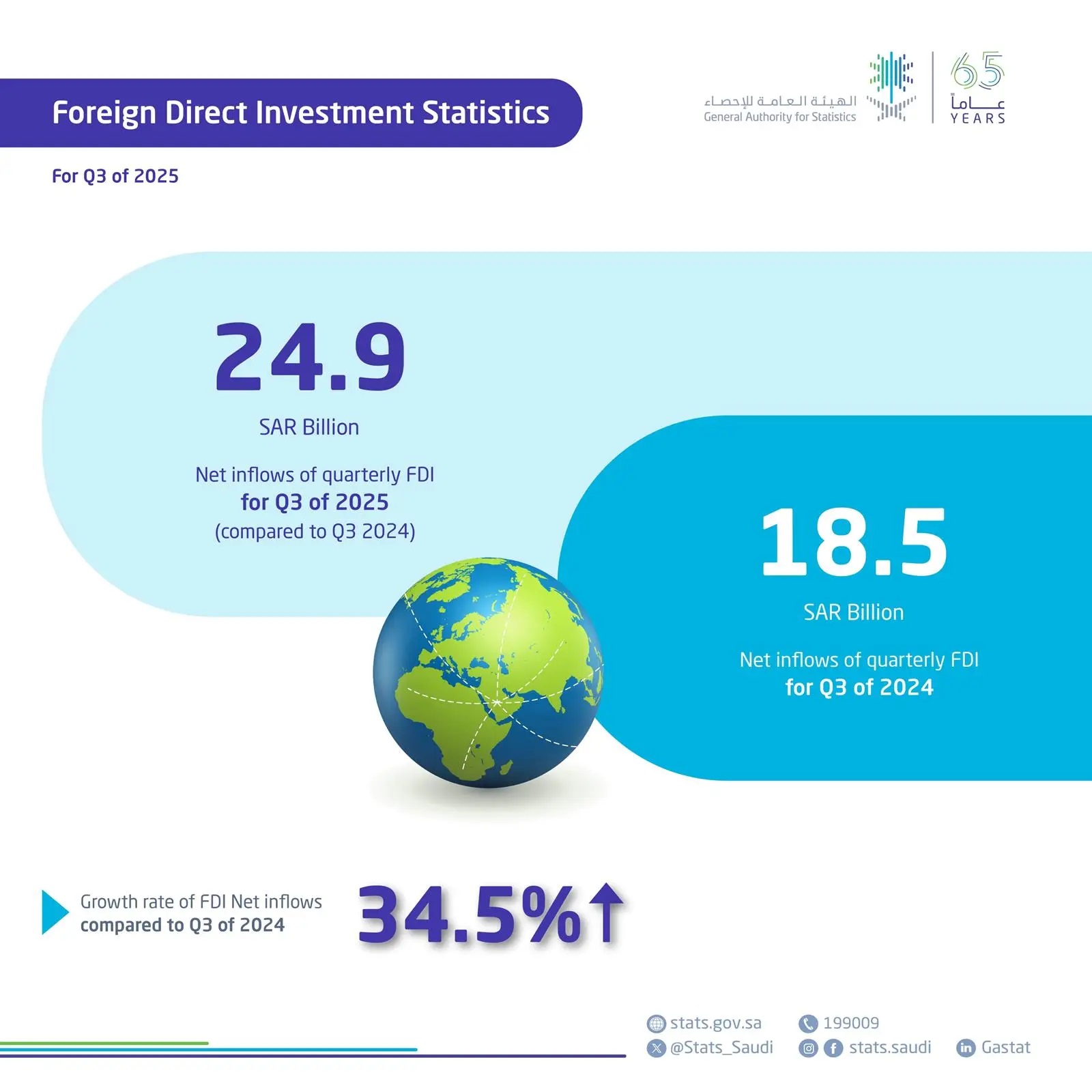 The Foreign Direct Investment (FDI) Statistics for the third quarter of 2025 revealed net inflows of SAR24.9 billion, reflecting a 34.5% increase compared to the same quarter of the previous year, when net inflows reached SAR18.5 billion. This figure also shows a 5.2% rise from the previous quarter, which recorded SAR23.7 billion, according to the FDI Statistics bulletin issued by the General Authority for Statistics (GASTAT).
