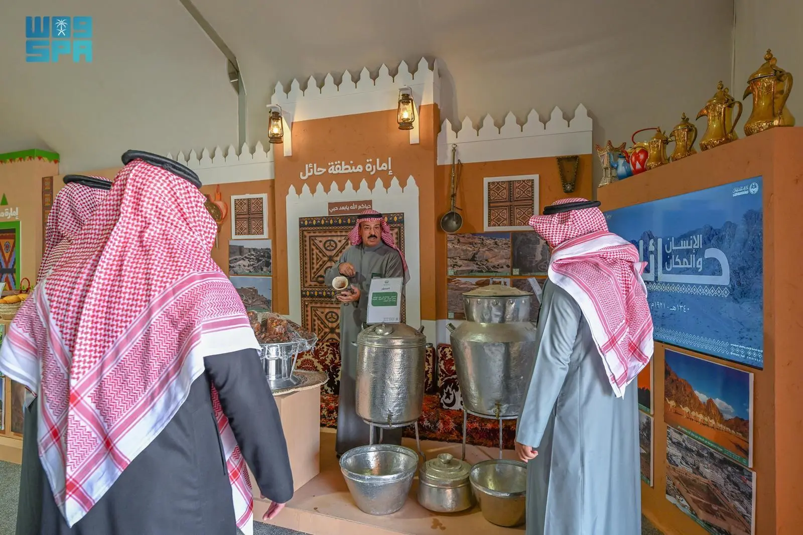 Hail Region pavilion at the Ministry of Interior’s Security Oasis exhibition, part of the 10th King Abdulaziz Camel Festival in Al-Sayahid, features heritage artifacts that reflect the region's renowned hospitality. The display includes ancient trays and copperware from nearly seventy years ago. These traditional food preparation and serving vessels have garnered significant interest from visitors. They document daily life in old Hail and its deep-rooted social traditions, particularly in gatherings and special occasions.