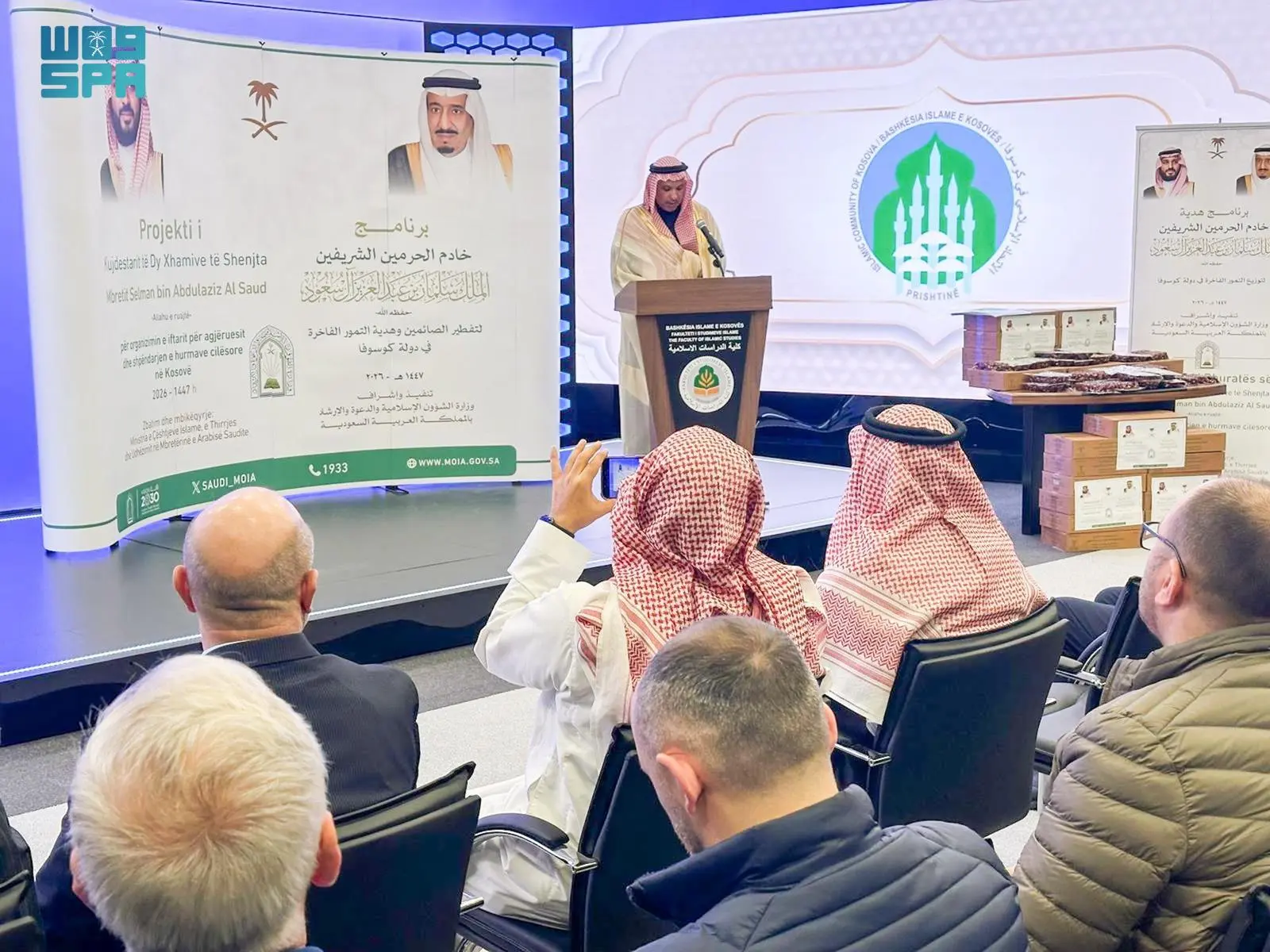 The Ministry of Islamic Affairs, Dawah and Guidance has begun implementing the Custodian of the Two Holy Mosques’ programs for iftar and the distribution of premium dates in the Republic of Kosovo. The launch ceremony was held on Ramadan 5 at the Islamic Sheikhdom in Pristina, in the presence of Saudi Ambassador to Albania Faisal Hifzi, Deputy Mufti of Albania Ahmed Sadri, and several Islamic figures.