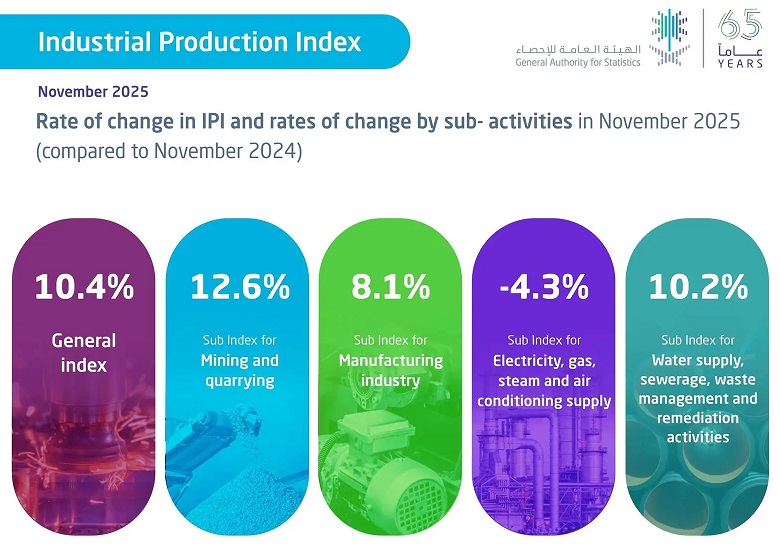The General Authority for Statistics (GASTAT) reported that the Industrial Production Index for November 2025 rose 10.4% year on year, driven by mining and quarrying, manufacturing, water supply, sewerage, waste management, and remediation activities, while falling 0.7% compared with October 2025.
